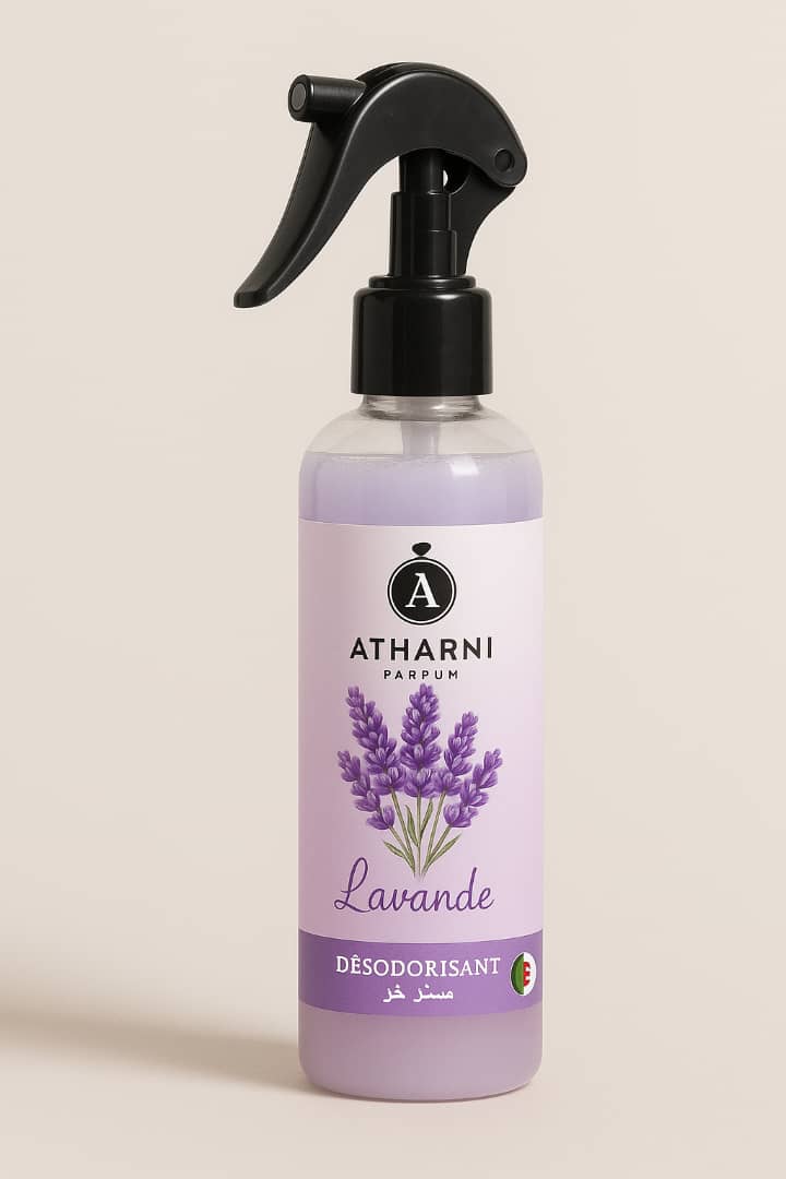 Désodorisant Atharni Lavande multi-usages 200ml – Idéal pour la maison, la voiture, le dressing ou les tissus. Élimine les mauvaises odeurs et laisse un parfum frais et agréable qui dure.