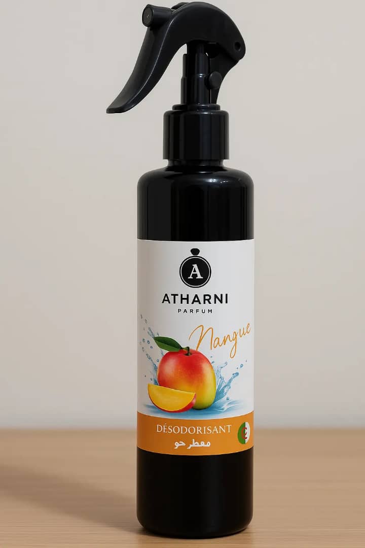 Désodorisant Atharni Mangue multi-usages 200ml – Idéal pour la maison, la voiture, le dressing ou les tissus. Élimine les mauvaises odeurs et laisse un parfum frais et agréable qui dure.